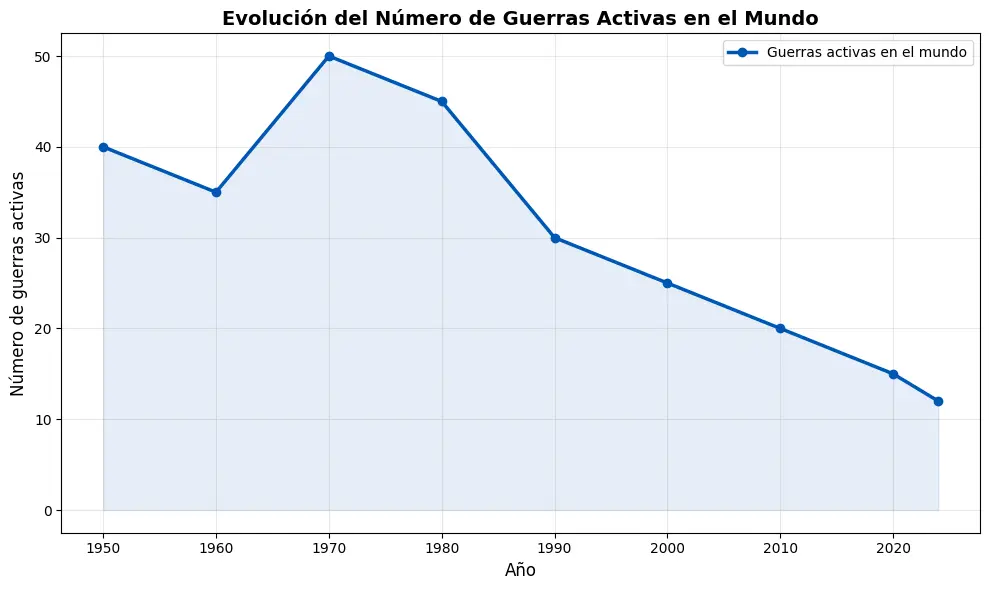Por último, el mundo también es hoy un lugar menos violento y más estable.Aunque persisten algunos conflictos regionales, el número de guerras activas ha disminuido de forma constante desde mediados del siglo XX. Menos guerras significan más estabilidad, menos incertidumbre y un entorno más favorable para el comercio y la inversión.