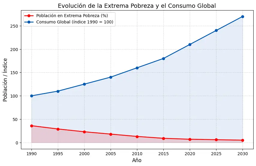Al mismo tiempo, la extrema pobreza está cayendo a mínimos históricos.Cada vez más personas tienen acceso a servicios básicos, educación y tecnología. Esto no solo mejora la calidad de vida, sino que aumenta el número de consumidores activos en la economía mundial.