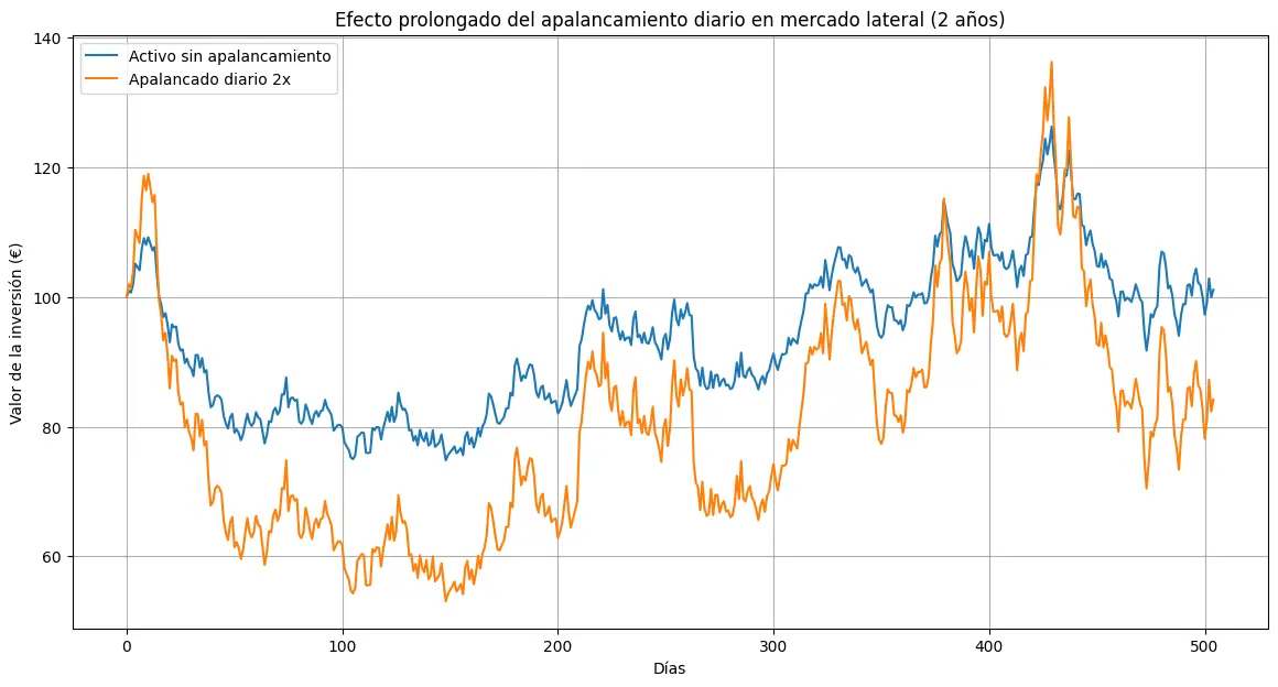 Los productos apalancados diarios reinician su cálculo cada día, por lo que el rendimiento acumulado no es lineal. Esto puede desvirtuar los resultados a medio y largo plazo, especialmente en mercados volátiles o laterales.Ejemplo: inviertes 100 € en un apalancado diario 2x: